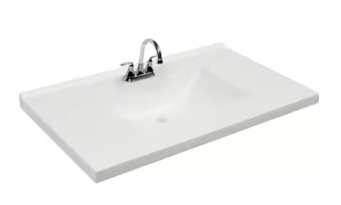 - The sink in this single-bowl vanity top has three pre-drilled faucet holes that allow for a 4-inch centerset mount faucet. The integrated sink features a non-drip edge and a safety overflow hole to avoid water overflow or spillage.