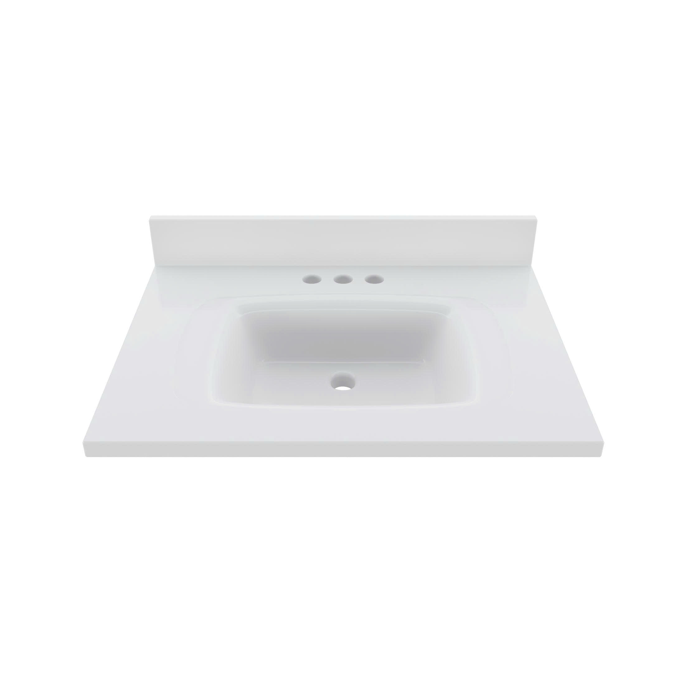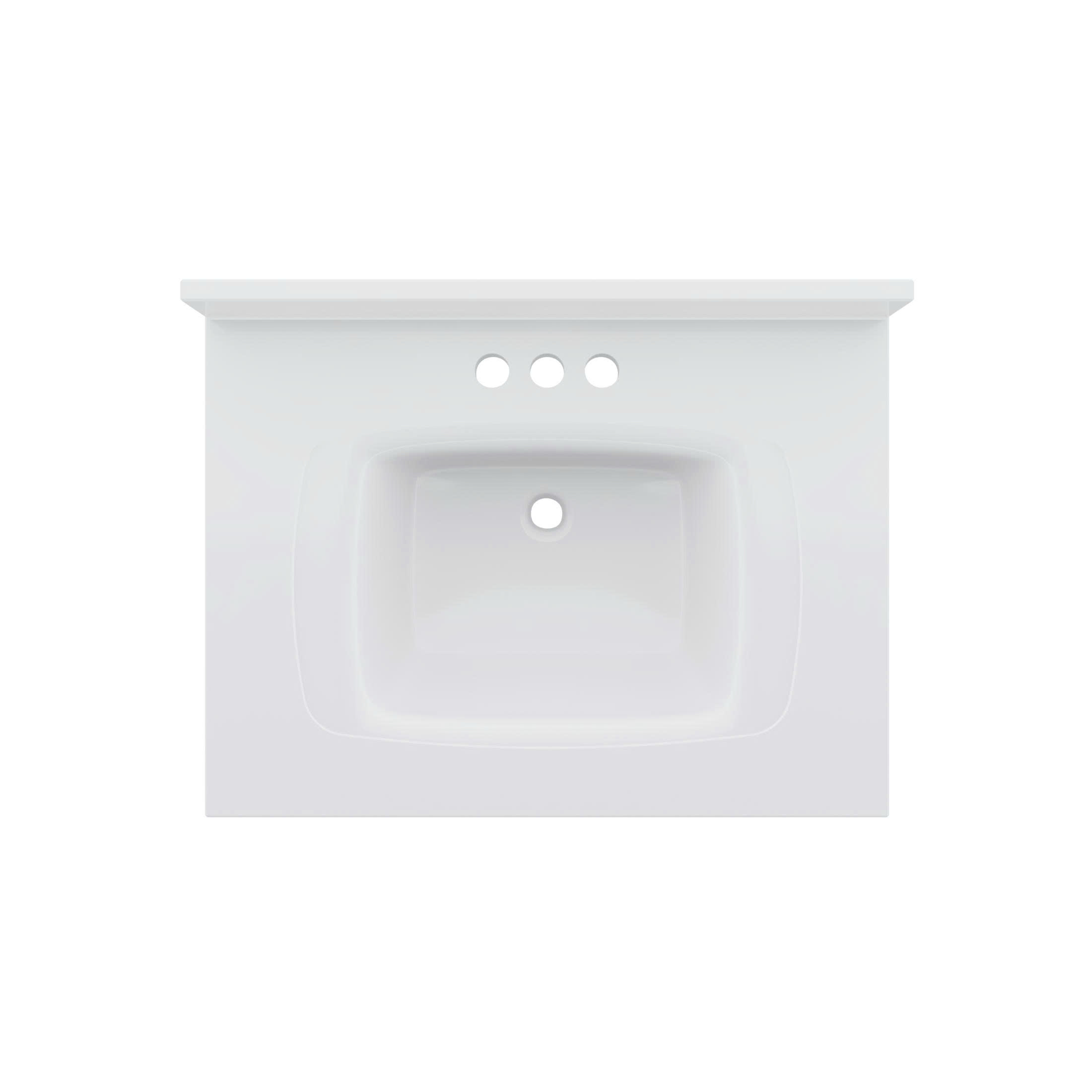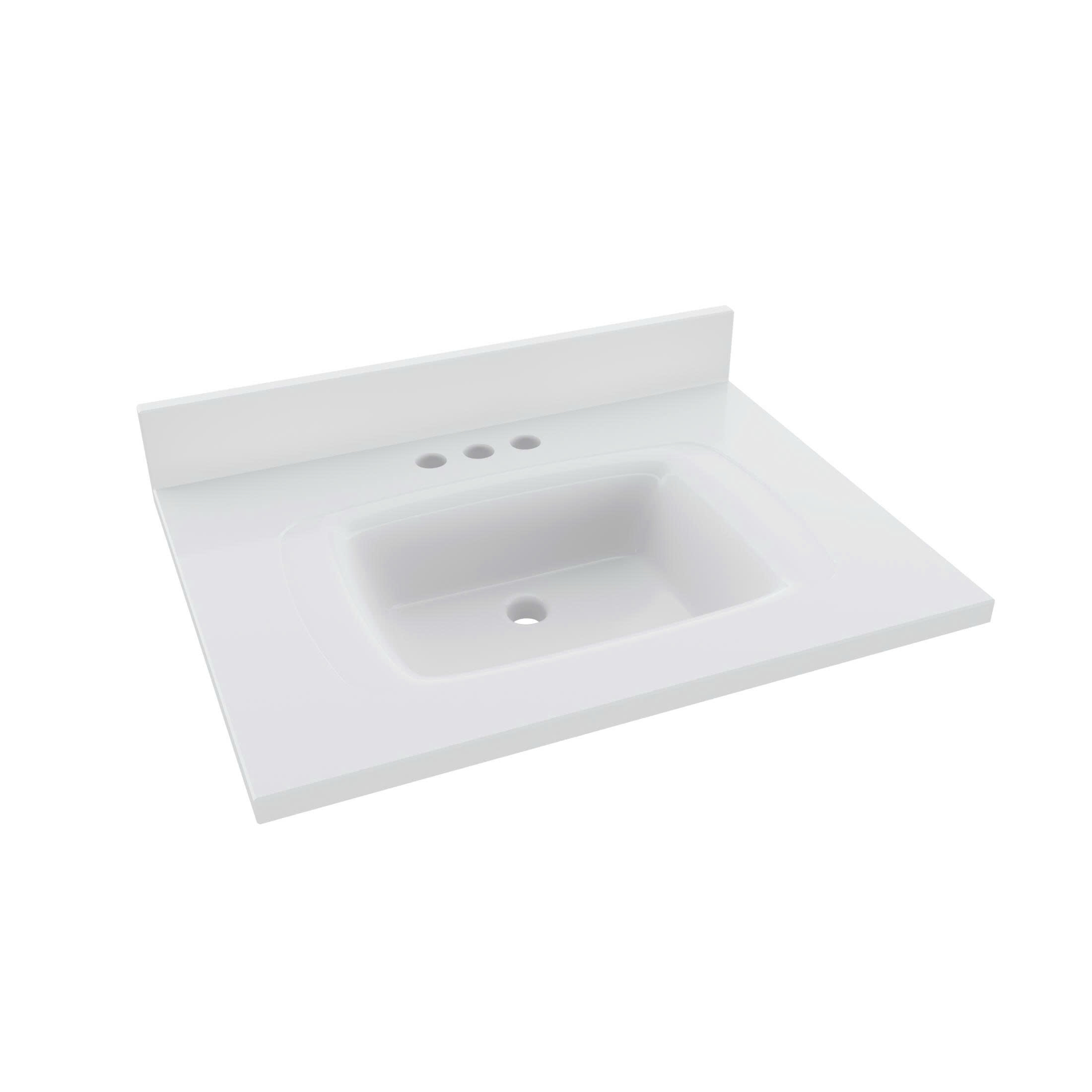 - The sink in this single-bowl vanity top has three pre-drilled faucet holes that allow for a 4-inch centerset mount faucet. The integrated sink features a non-drip edge and a safety overflow hole to avoid water overflow or spillage, while the 4-inch integrated backsplash helps prevent water damage to your wall.