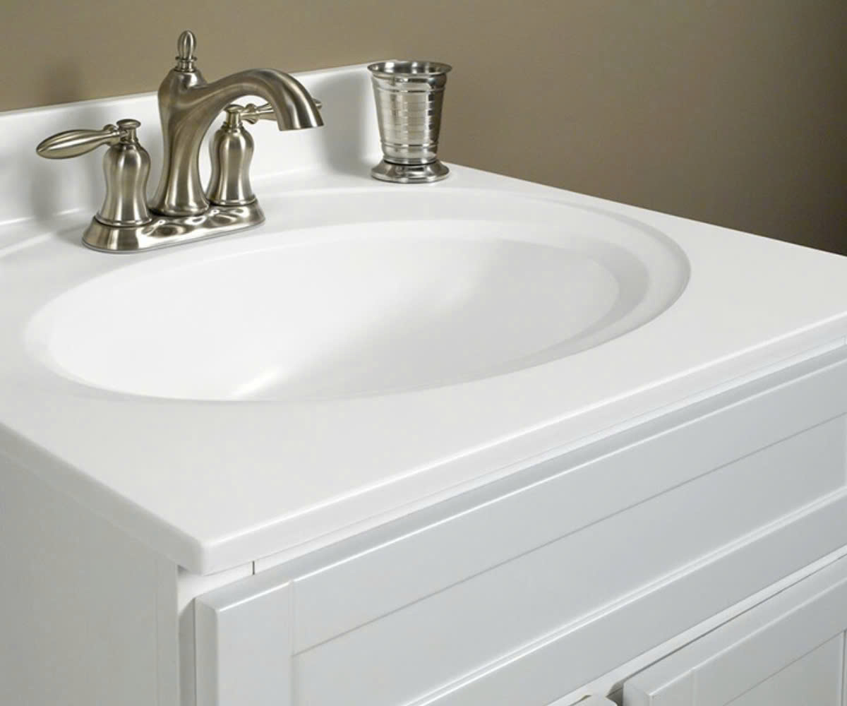 - Add a fresh, bright look to your bathroom with the Polystone Cultured Marble Vanity Top. This bathroom vanity top is 25-inches long for use on 24-inch vanity cabinets and features a contemporary super white / solid white (2 màu – 2 mã và mô tả khác nhau) finish. The oval bowl and square dripless edge profile offer an updated yet modest look to blend seamlessly with any bathroom decor style.